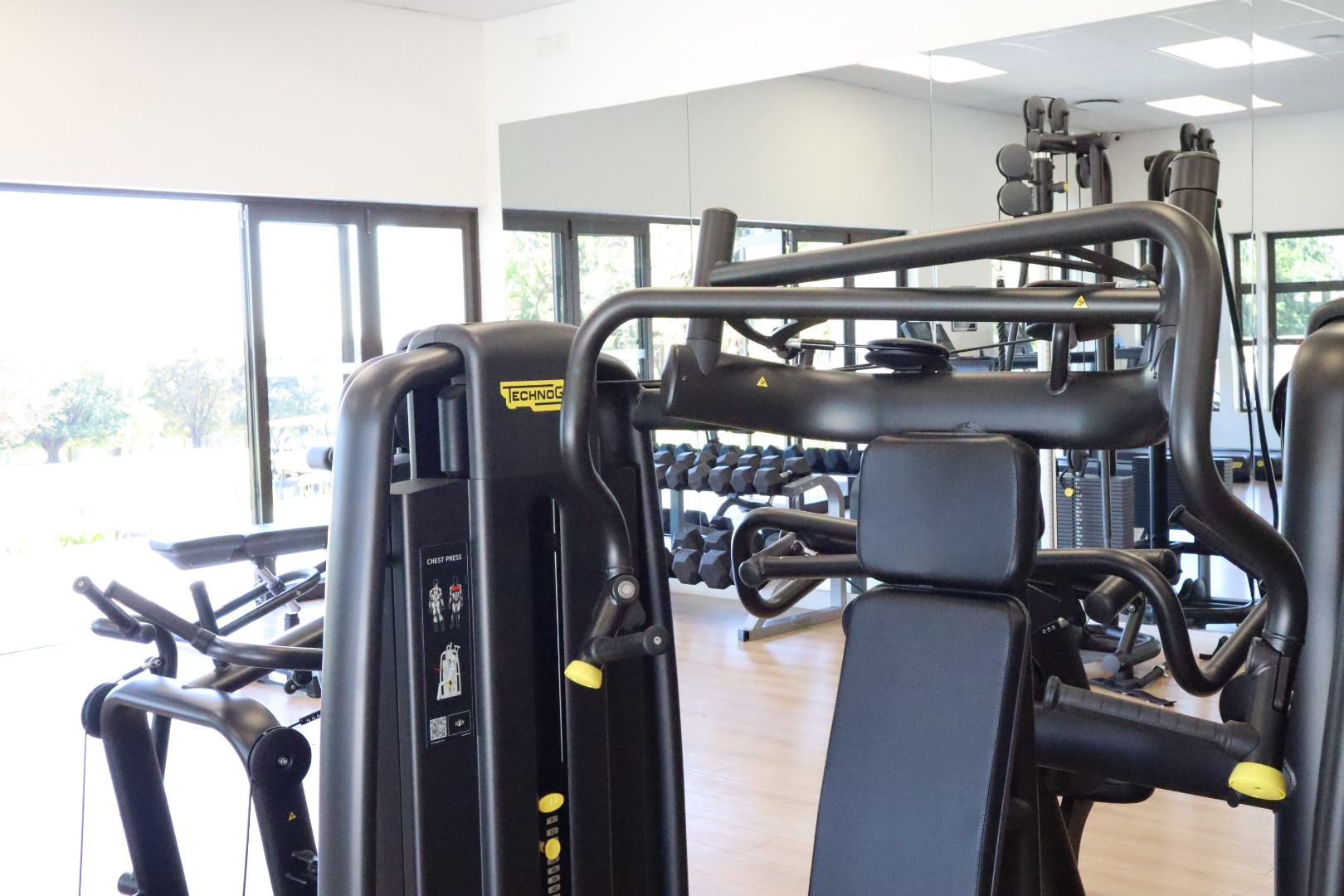 Health and wellness are prioritized with a state-of-the-art gym outfitted with Technogym equipment and expansive windows overlooking lush greenery, creating an inspiring space to stay active.