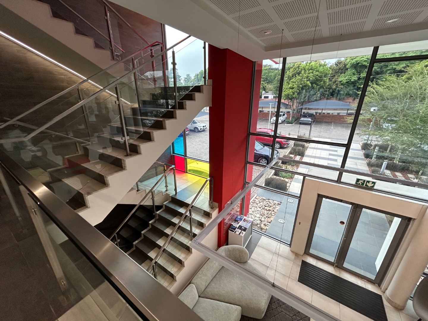 The building itself presents a striking architectural statement with its distinctive red and multi-colored glass facade, offering excellent kerb appeal. Ample parking is available with 12 dedicated bays, providing convenience for both staff and clients. The property benefits from an integrated security camera, contributing to a secure operational environment. Balconies offer potential outdoor access, adding to the appeal of this modern commercial offering.