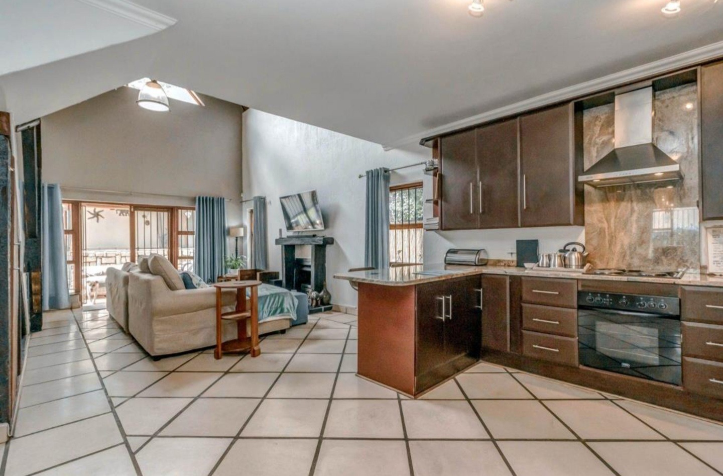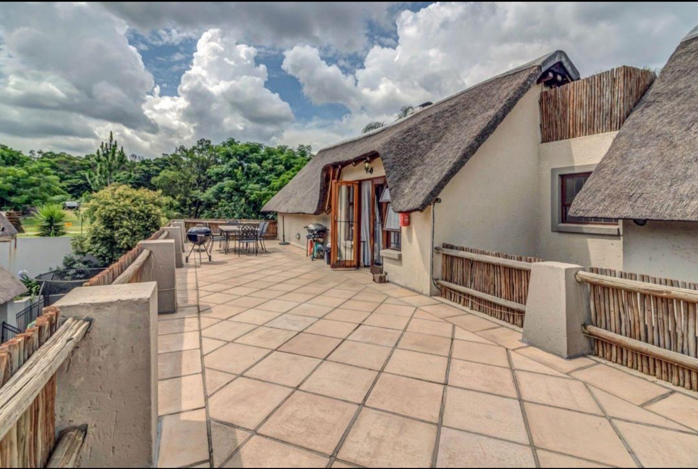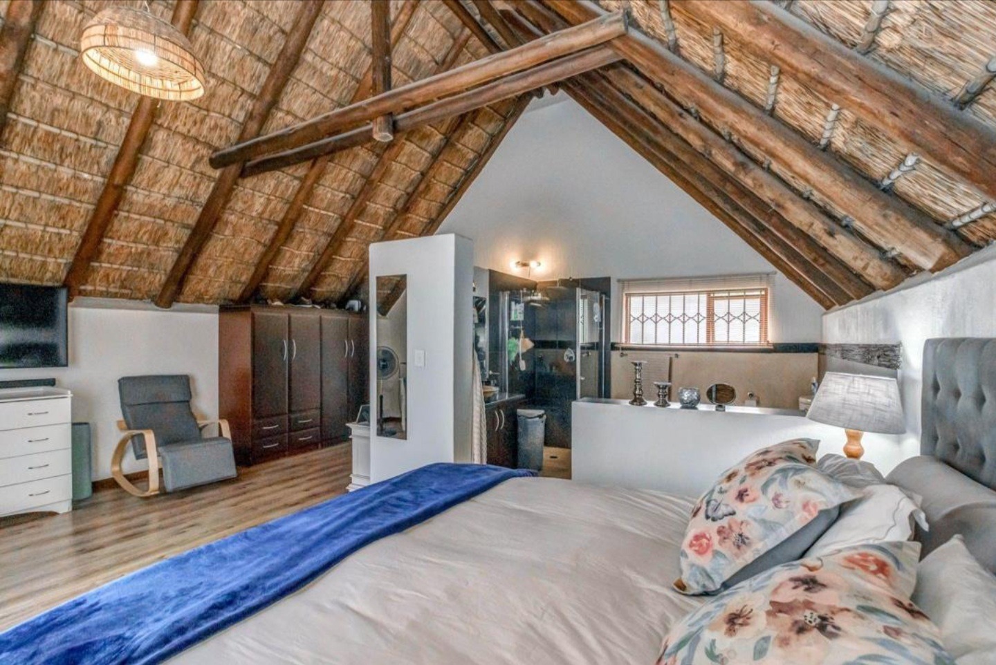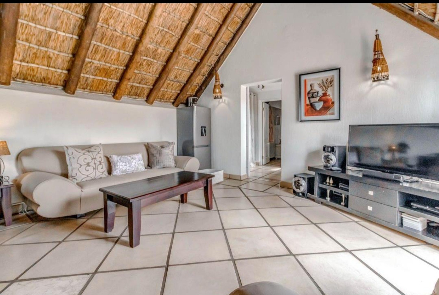 Welcome to this charming 3-bedroom, 3-bathroom home available for rent in Craigavon, Sandton, offering a unique living experience with its distinctive thatch roof design. Spanning a generous 331 sqm, this property features an inviting open-plan layout with high vaulted ceilings that create a wonderfully bright and airy feel, thanks to ample natural light. You'll find two comfortable lounges and a dedicated dining room, perfect for both everyday living and entertaining. The heart of the home, the kitchen, is well-appointed with dark wood cabinetry, sleek granite countertops and a practical island with a breakfast bar. Tiled flooring throughout ensures easy maintenance and a cohesive look.