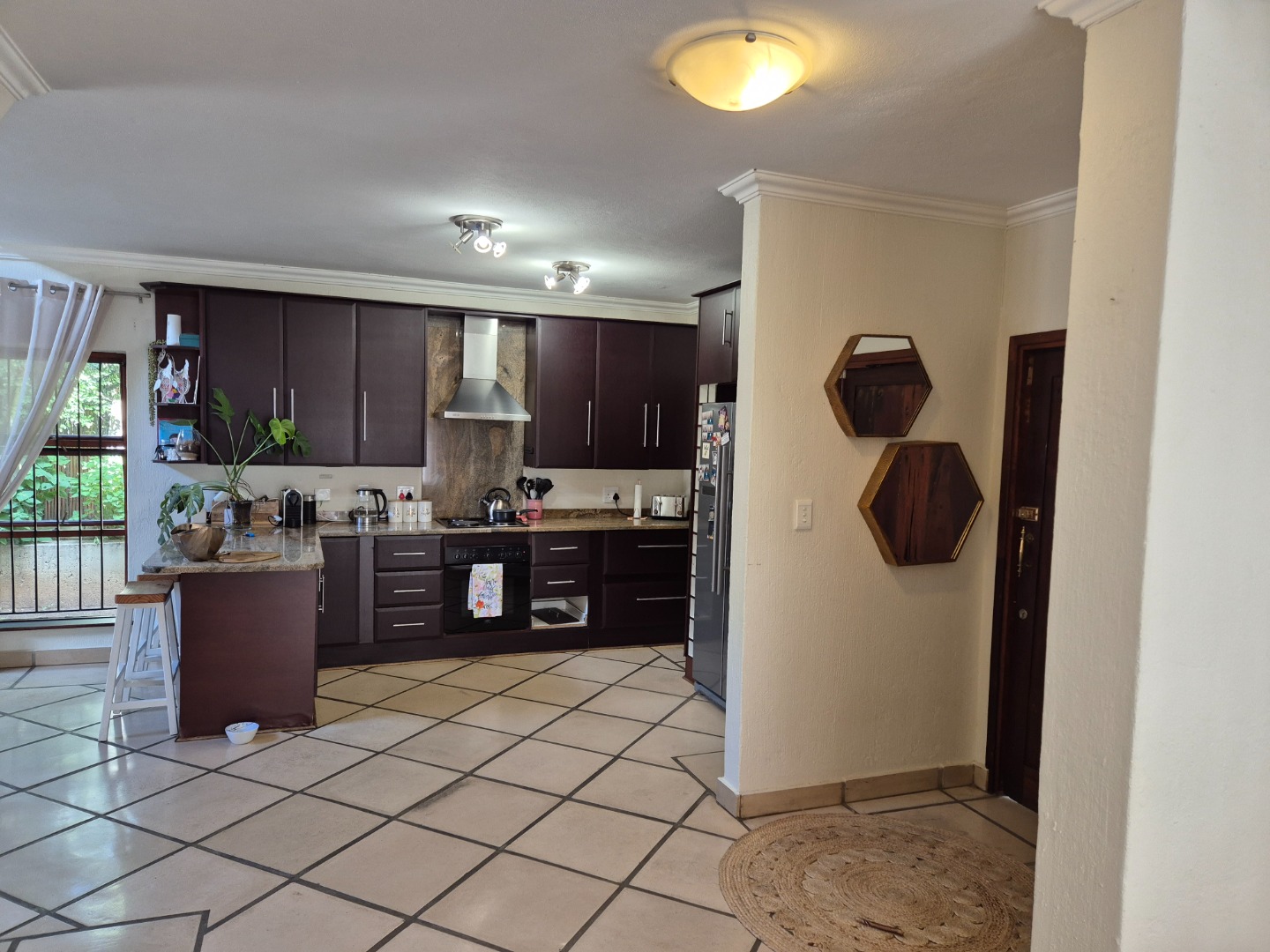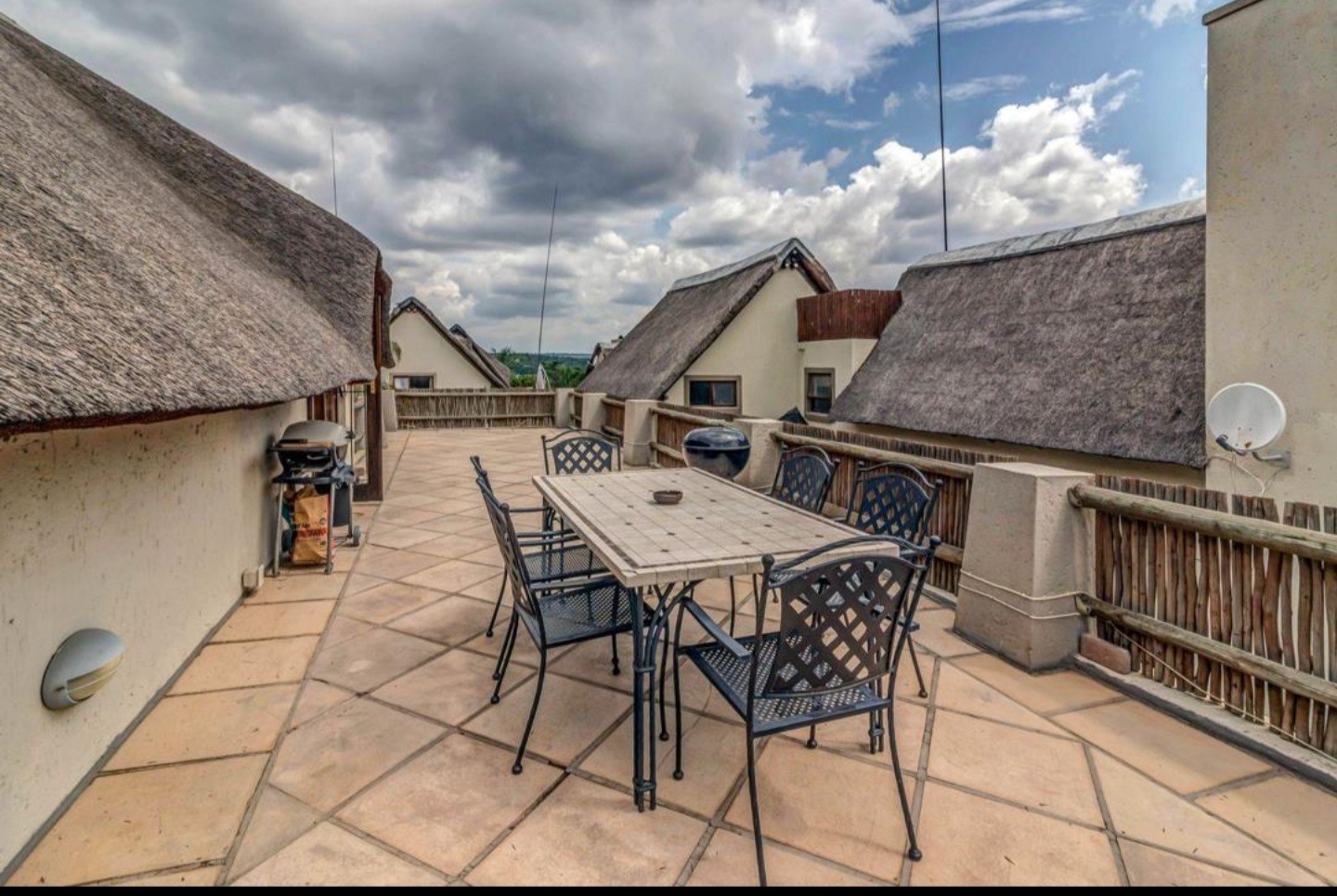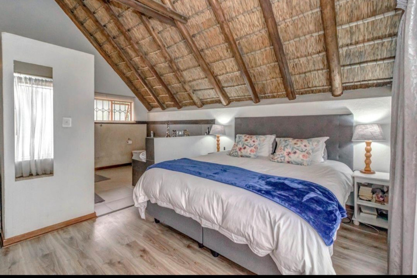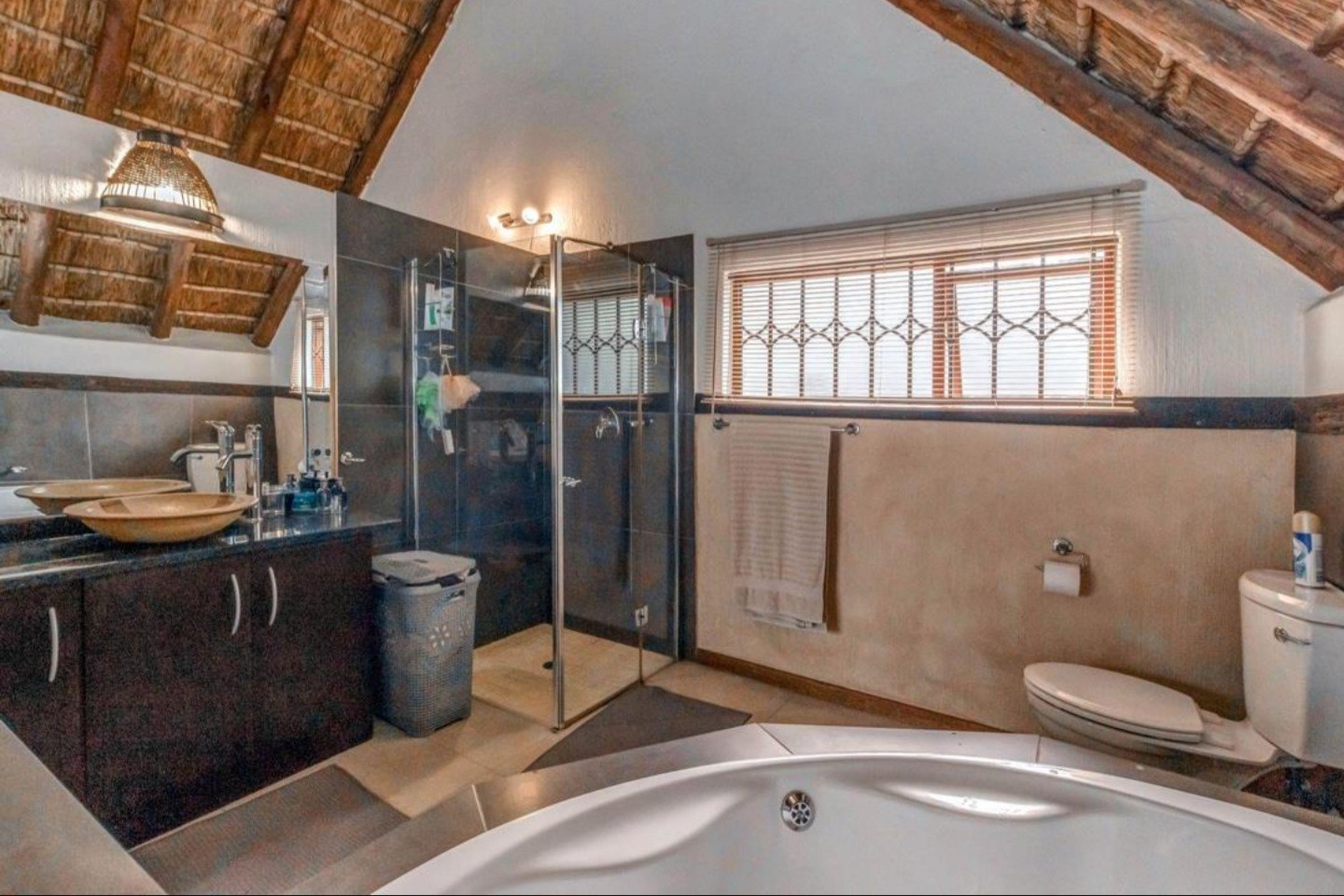 Welcome to this charming 3-bedroom, 3-bathroom home available for rent in Craigavon, Sandton, offering a unique living experience with its distinctive thatch roof design. Spanning a generous 331 sqm, this property features an inviting open-plan layout with high vaulted ceilings that create a wonderfully bright and airy feel, thanks to ample natural light. You'll find two comfortable lounges and a dedicated dining room, perfect for both everyday living and entertaining. The heart of the home, the kitchen, is well-appointed with dark wood cabinetry, sleek granite countertops and a practical island with a breakfast bar. Tiled flooring throughout ensures easy maintenance and a cohesive look.