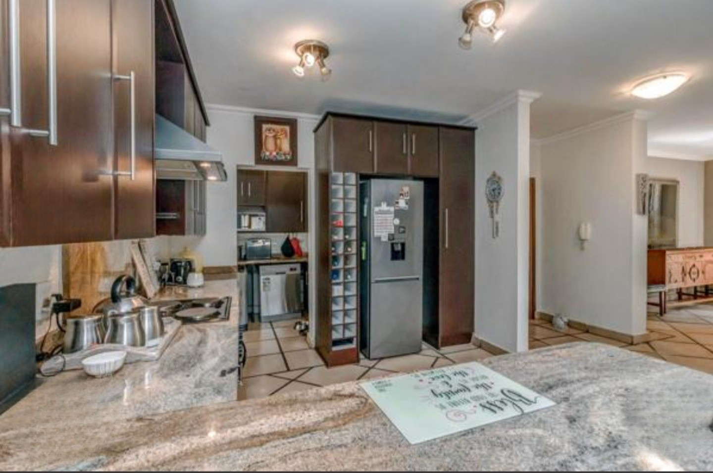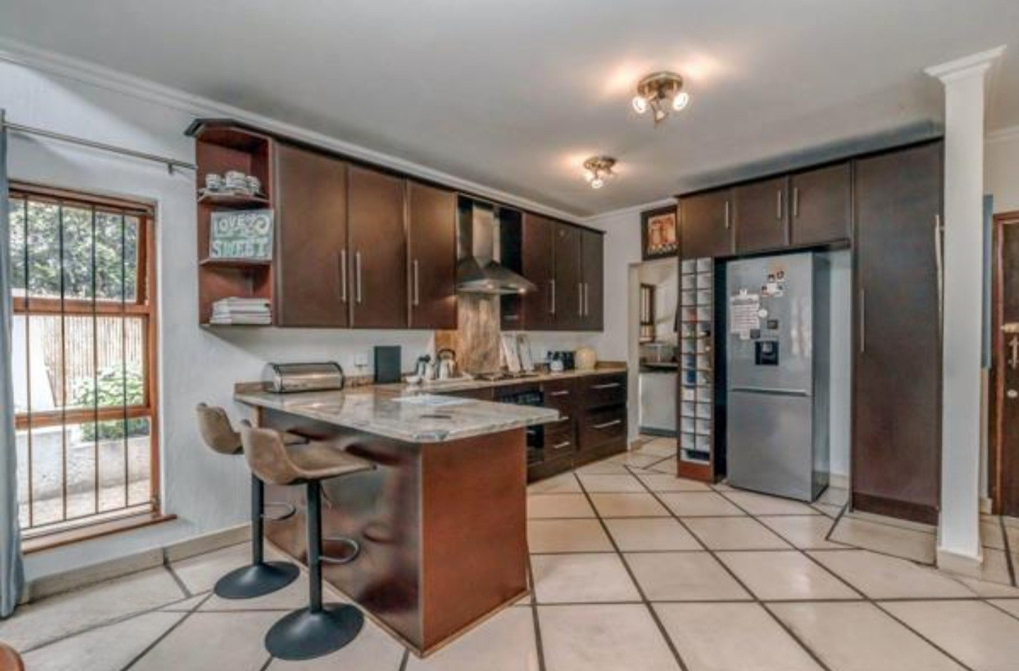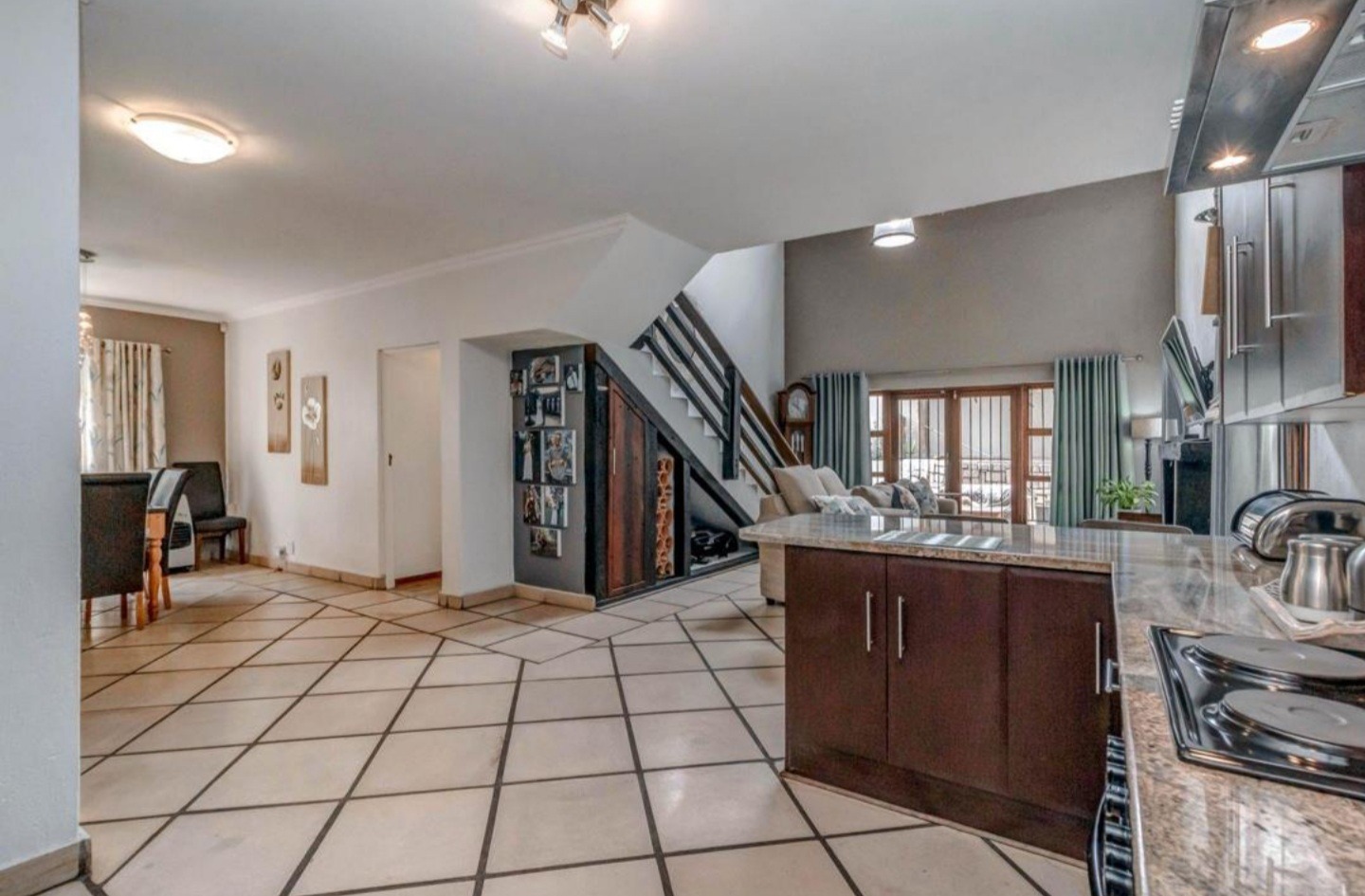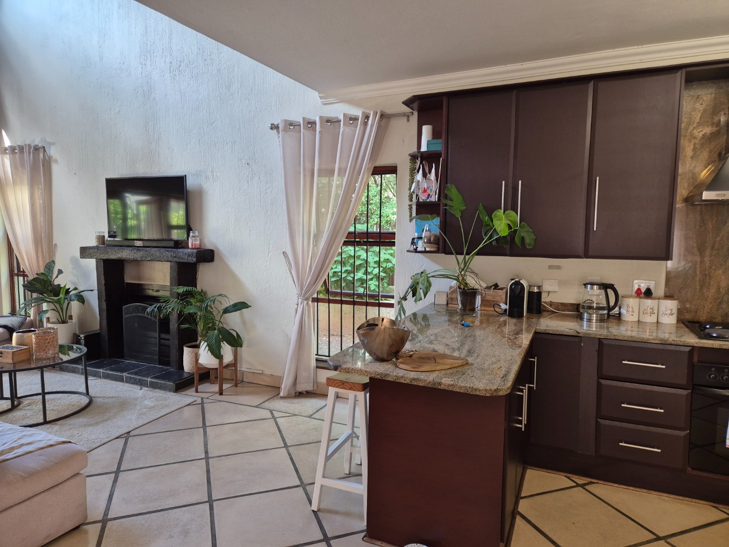 Welcome to this charming 3-bedroom, 3-bathroom home available for rent in Craigavon, Sandton, offering a unique living experience with its distinctive thatch roof design. Spanning a generous 331 sqm, this property features an inviting open-plan layout with high vaulted ceilings that create a wonderfully bright and airy feel, thanks to ample natural light. You'll find two comfortable lounges and a dedicated dining room, perfect for both everyday living and entertaining. The heart of the home, the kitchen, is well-appointed with dark wood cabinetry, sleek granite countertops and a practical island with a breakfast bar. Tiled flooring throughout ensures easy maintenance and a cohesive look.