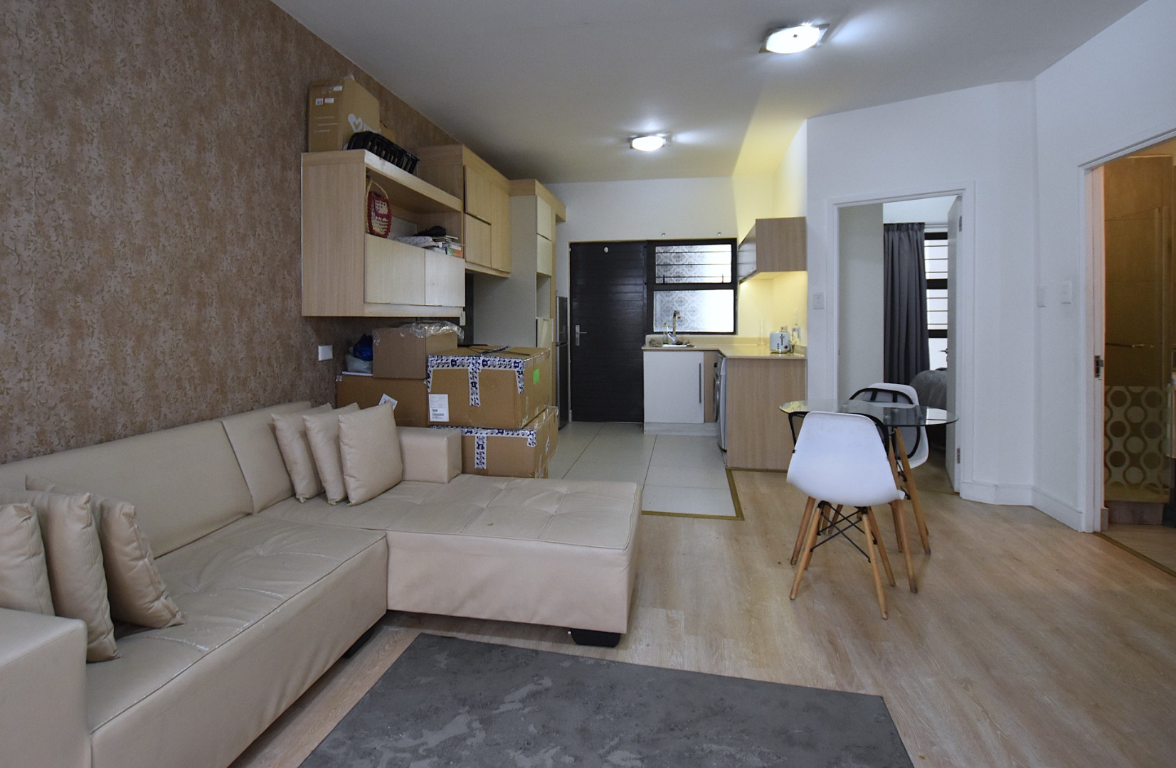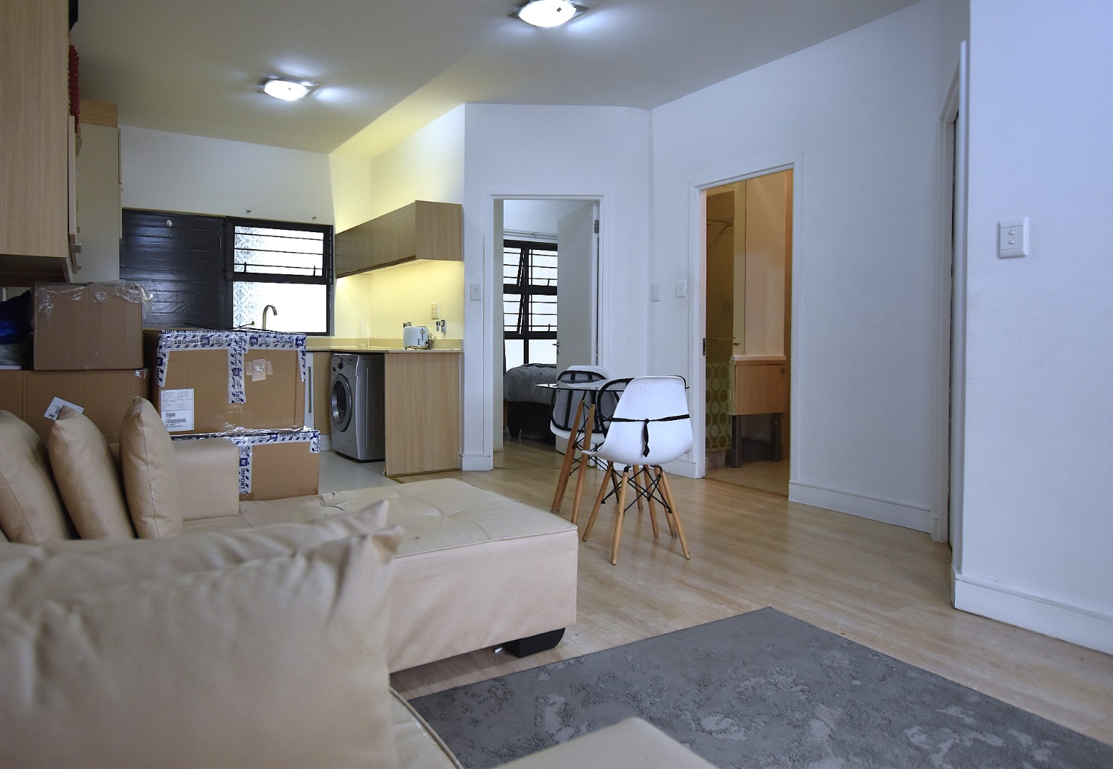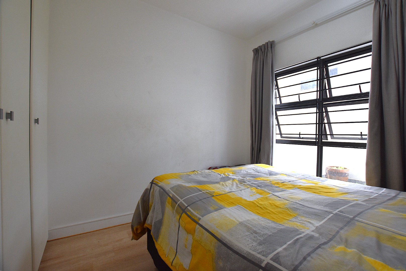 There are two bedrooms with built-in cupboards and laminated flooring, one bathroom with shower.