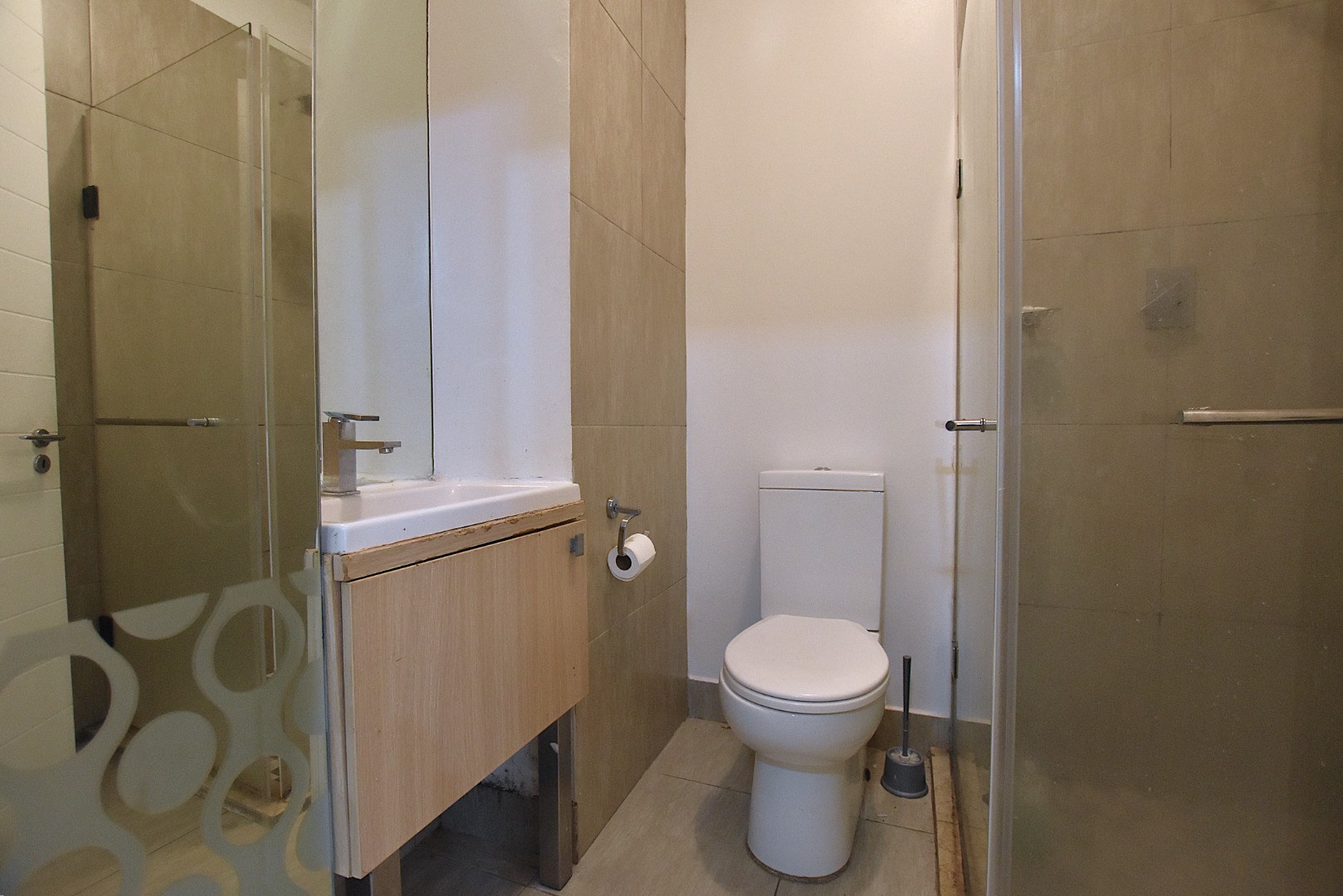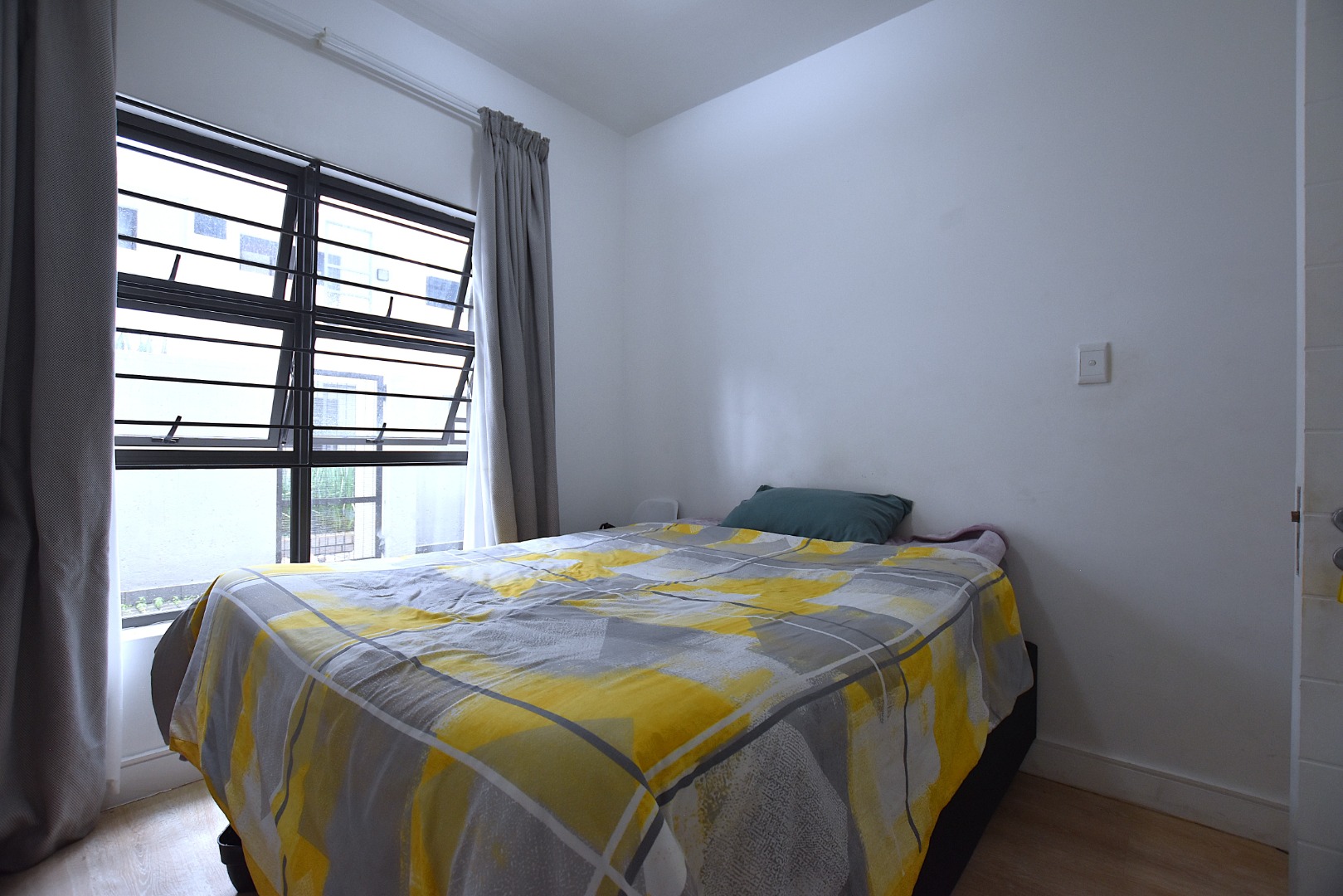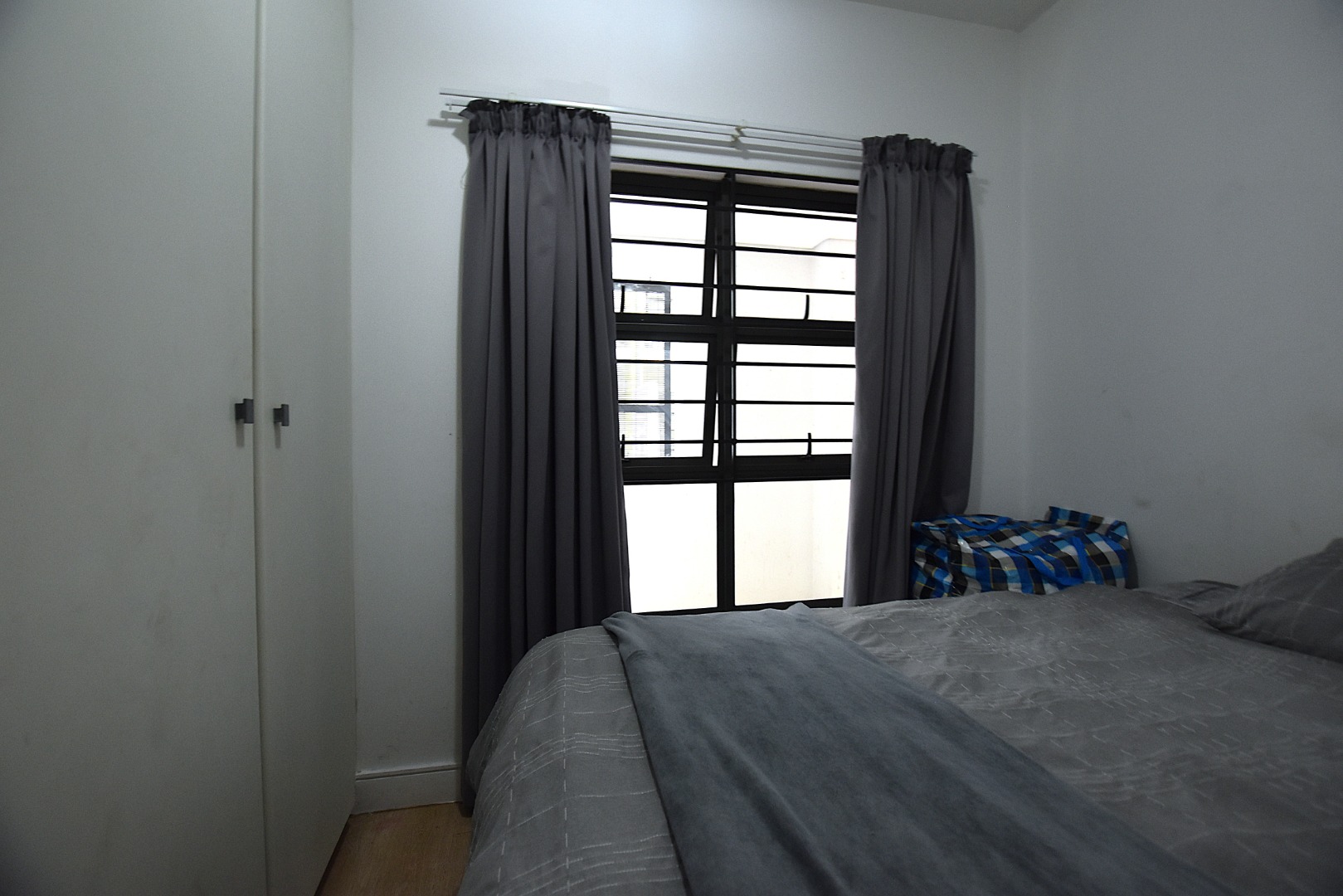 There are two bedrooms with built-in cupboards and laminated flooring, one bathroom with shower.