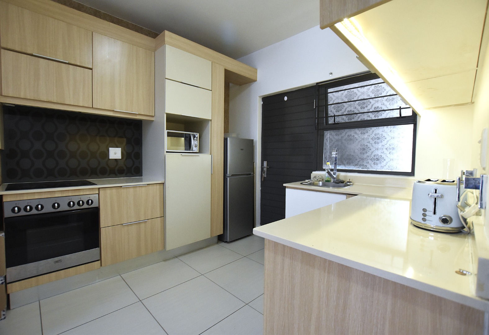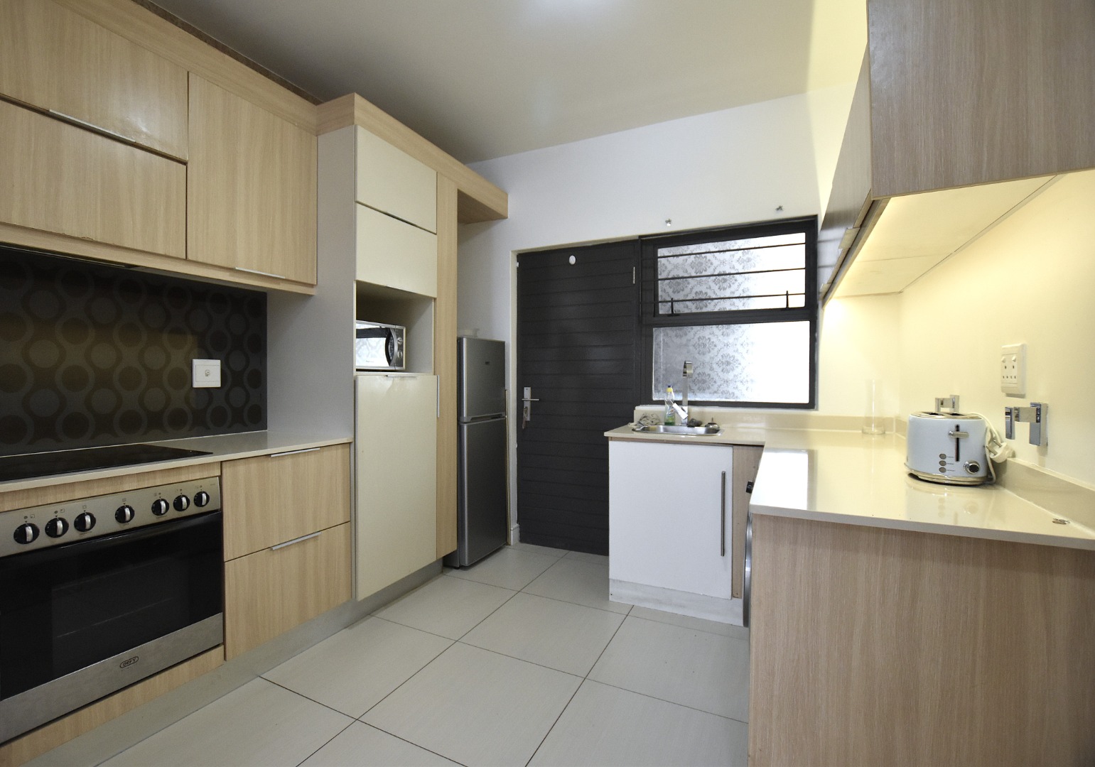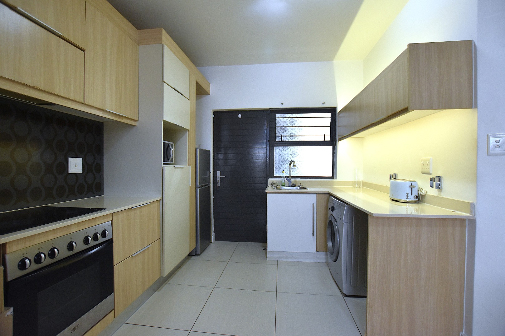 The kitchen consists of stove with electric hob, Caesarstone counter tops, space for a refrigerator and two under countertop appliances.