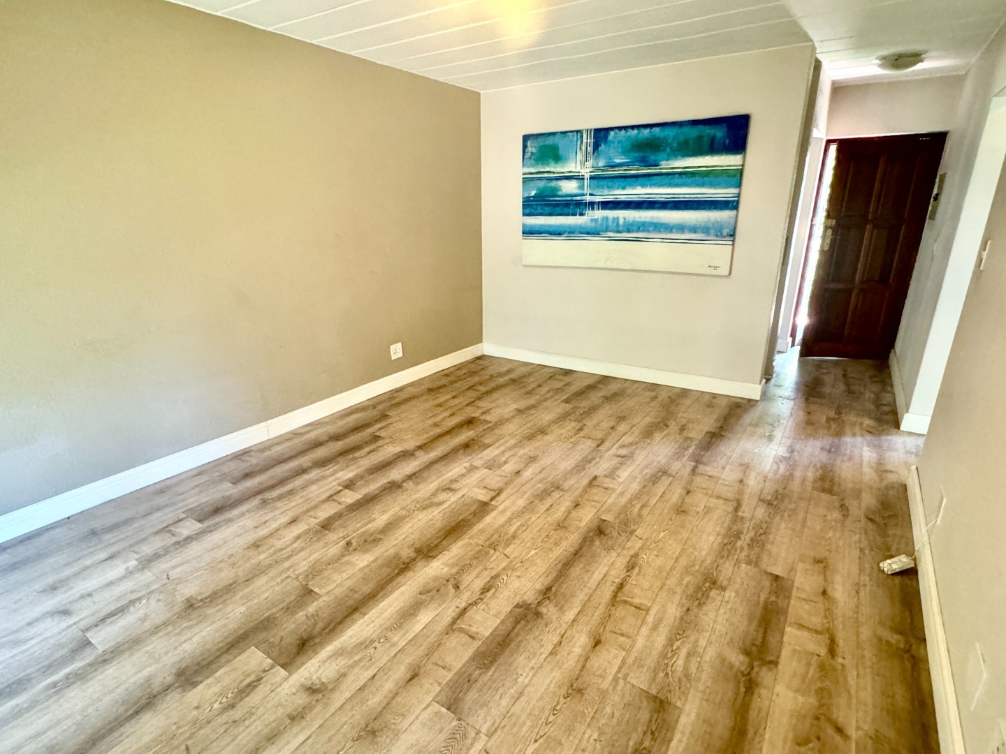 The bathroom has been stylishly redone and boasts a spacious shower for a touch of luxury. The light-filled living space opens onto a quaint patio through elegant stacker doors, offering the perfect spot to relax.