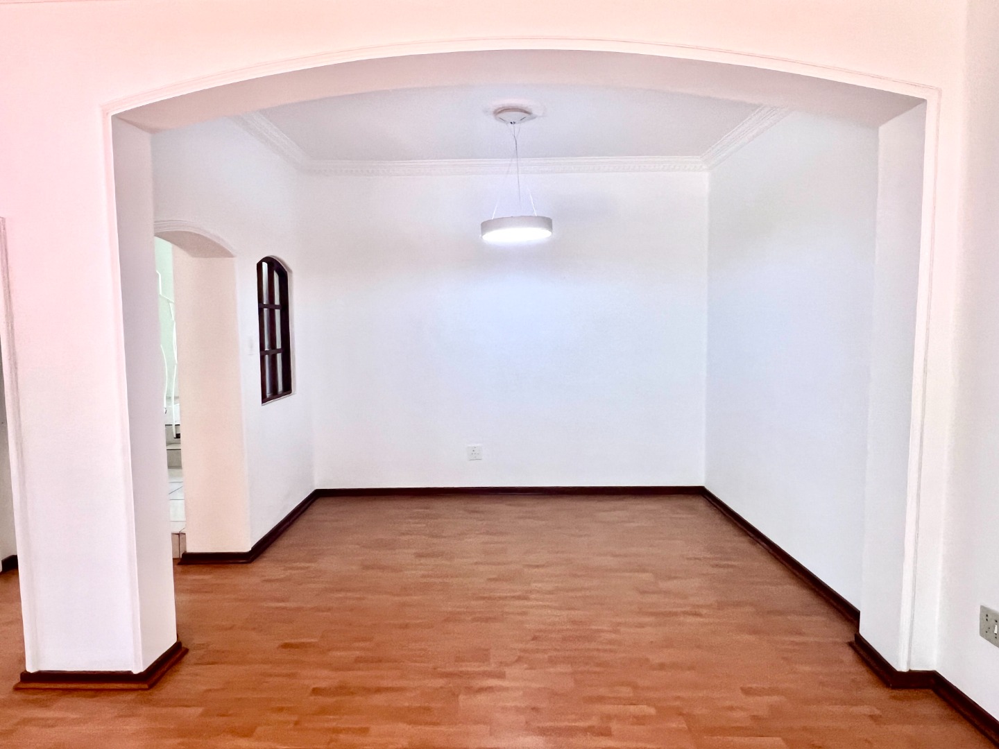 Storage space is essential in any home, and this property offers a solution with cupboard space beneath the stairs, providing ample room to store belongings. The living area is spacious enough to accommodate a lounge suite and a dining room table, making it a versatile space for both relaxation and dining. The laminated floors add a touch of elegance and are easy to maintain.