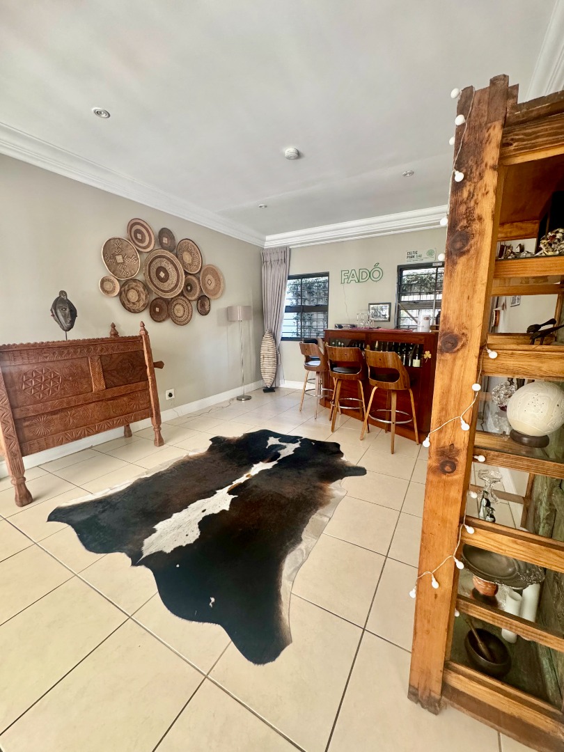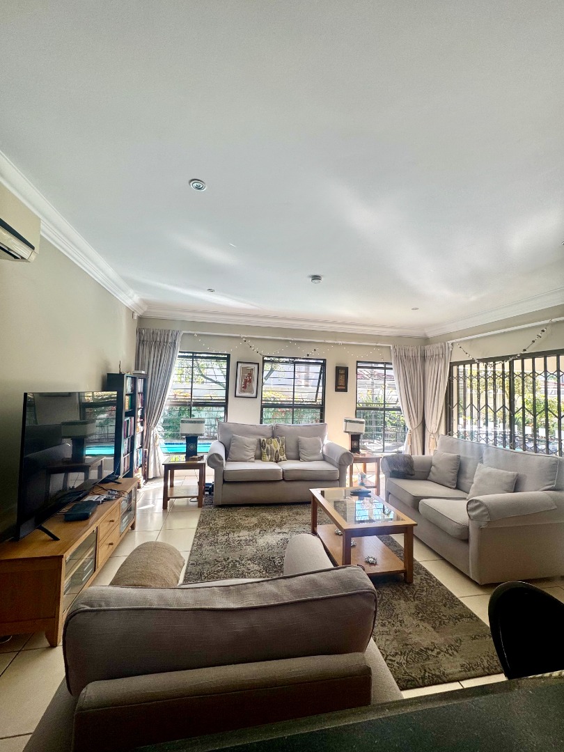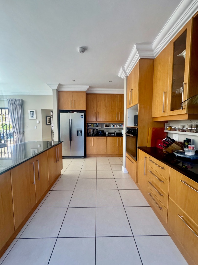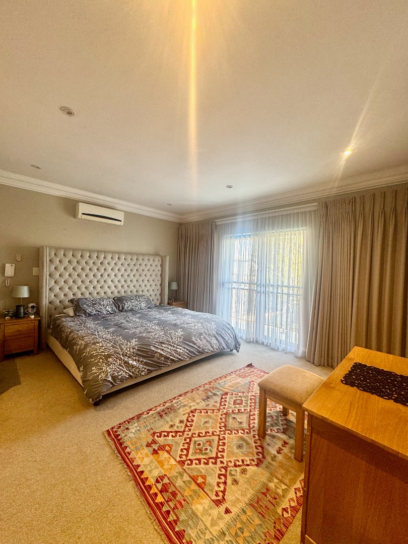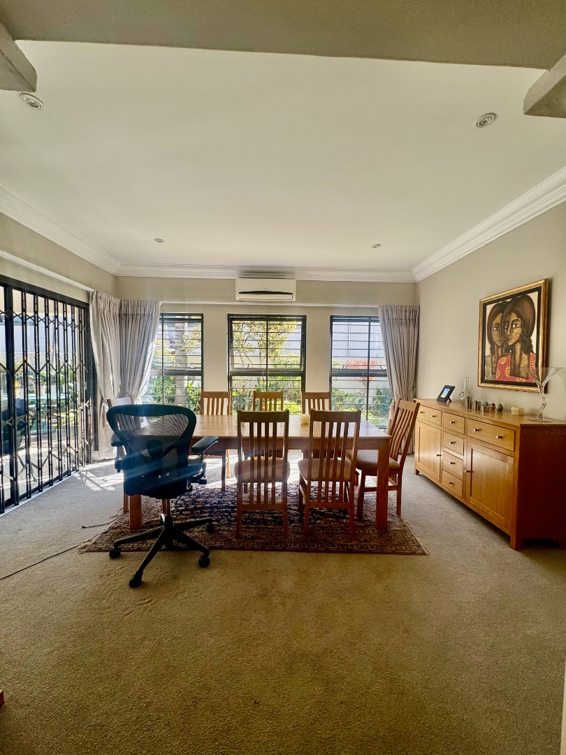Designed for effortless living and entertaining, the home features 3 expansive reception rooms with air-conditioning and patio access, an open-plan dining room and modern granite-topped kitchen, and a separate scullery with space for 3 appliances. The covered entertainer’s patio overlooks a lush established garden and a secured gated pool, creating an ideal indoor-outdoor lifestyle.