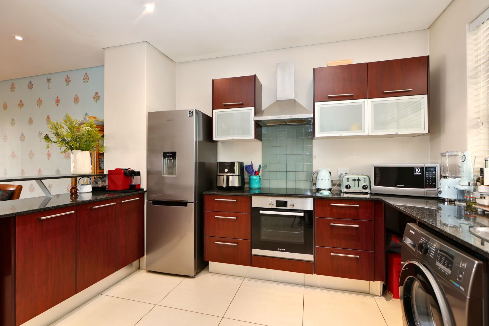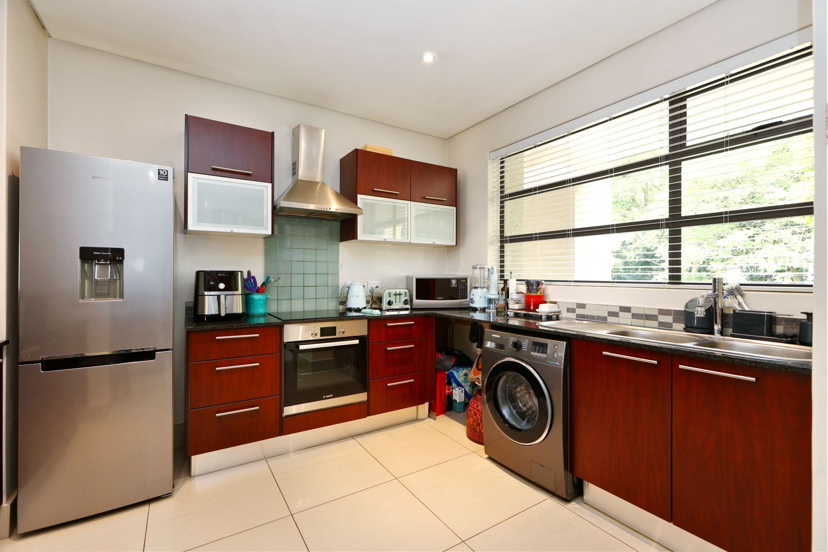 Step into an inviting open-plan living and dining area, bathed in natural light and adorned with sleek tiled flooring and elegant recessed lighting. The heart of this home is its modern kitchen, a culinary haven featuring rich dark wood cabinetry, lustrous granite countertops, and a suite of integrated stainless steel appliances, ensuring both style and functionality for effortless entertaining.