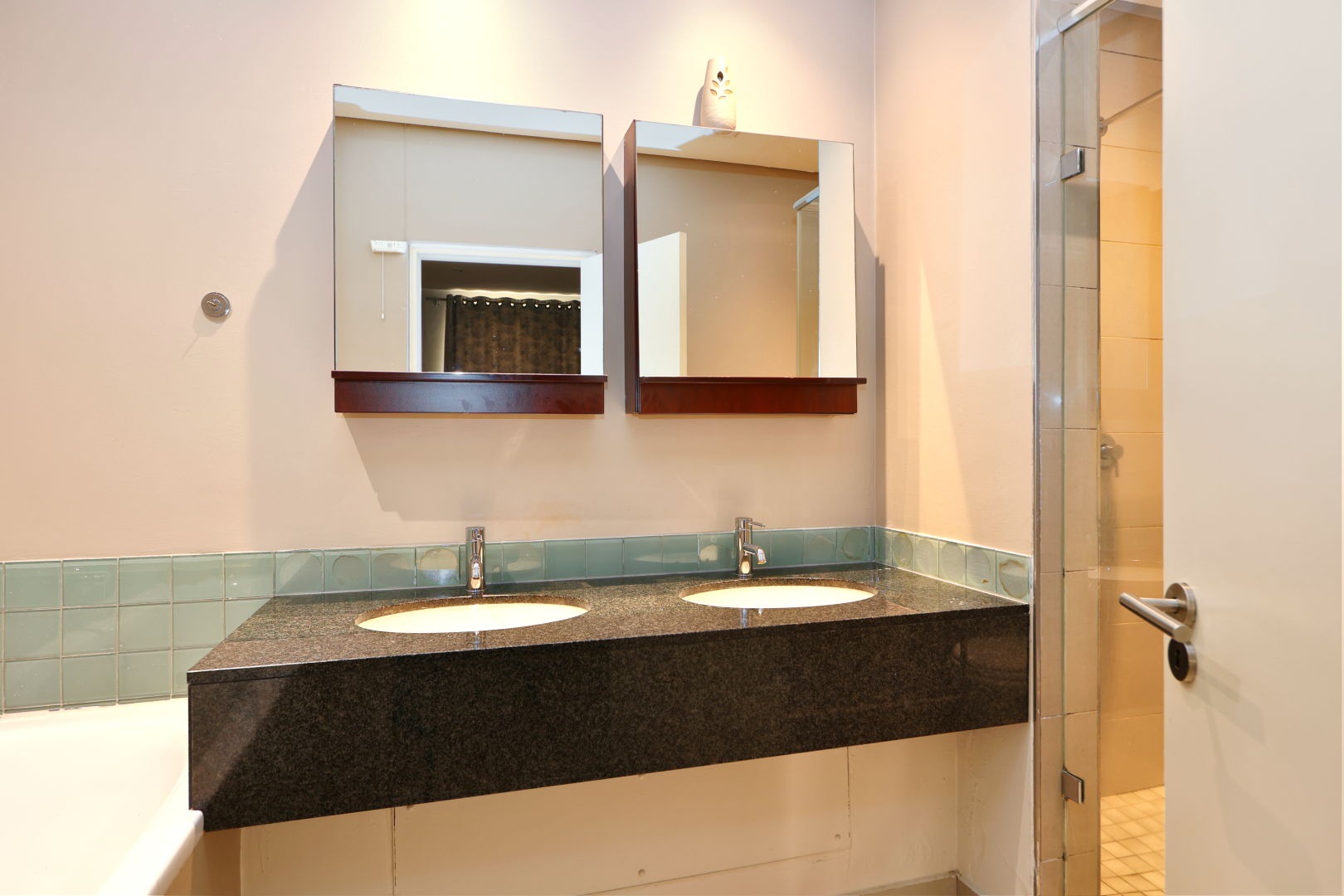The property boasts two serene bedrooms, each a private sanctuary designed for ultimate comfort. The master suite offers generous built-in wardrobes and direct access to a private balcony, providing a tranquil retreat with verdant views. Complementing these are two well-appointed bathrooms, showcasing a double vanity with granite, a separate shower, and a luxurious bathtub, promising a spa-like experience.