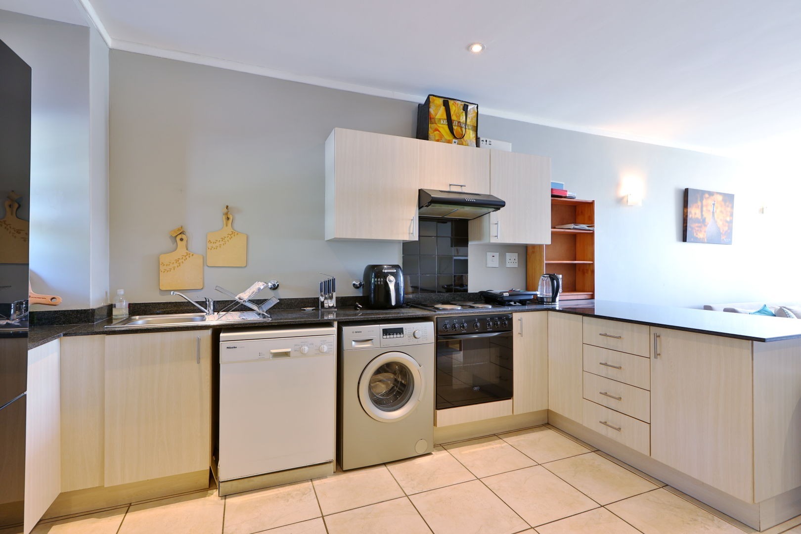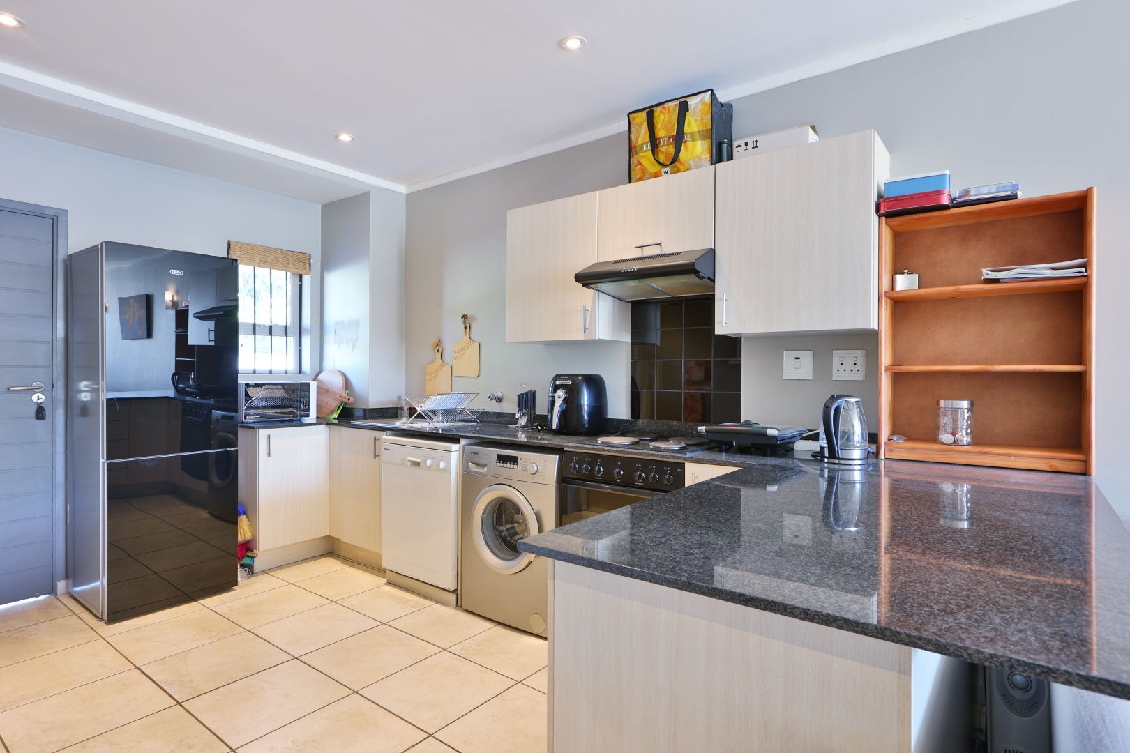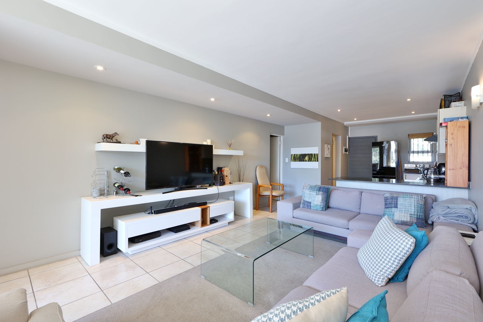 The kitchen is overlooking the stunning open-plan living area. Beautifully tiled throughout, ample room to set up an dining suite to enjoy intimate lunches and dinners with close friends and family.