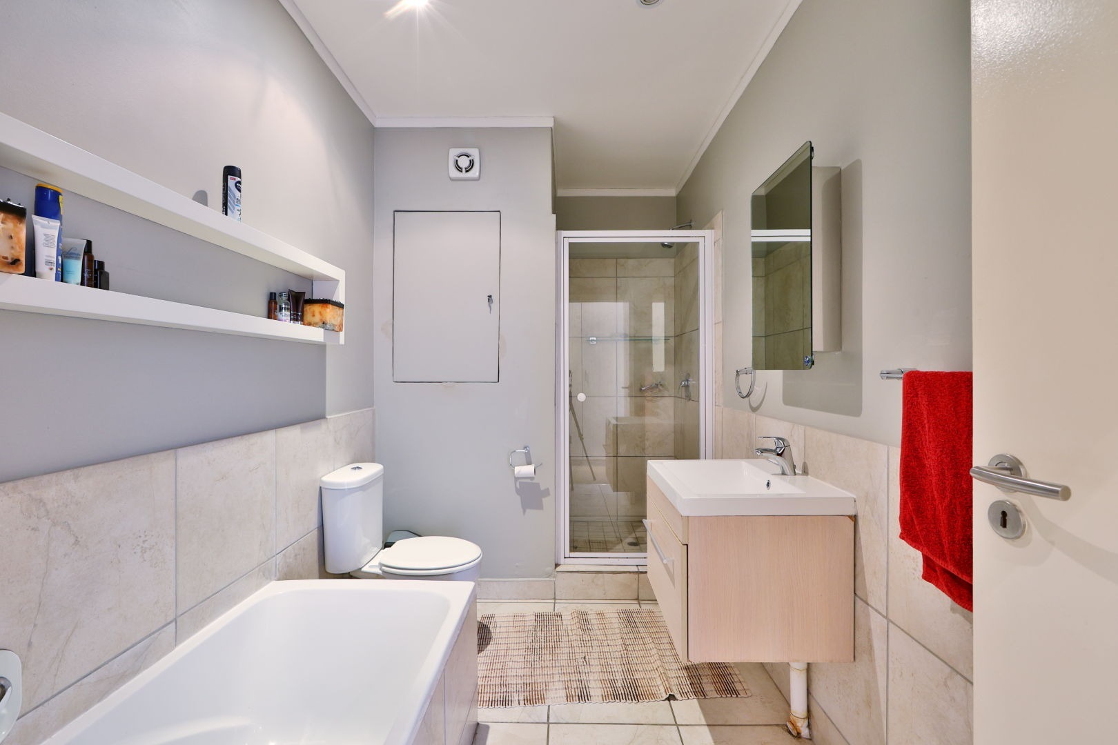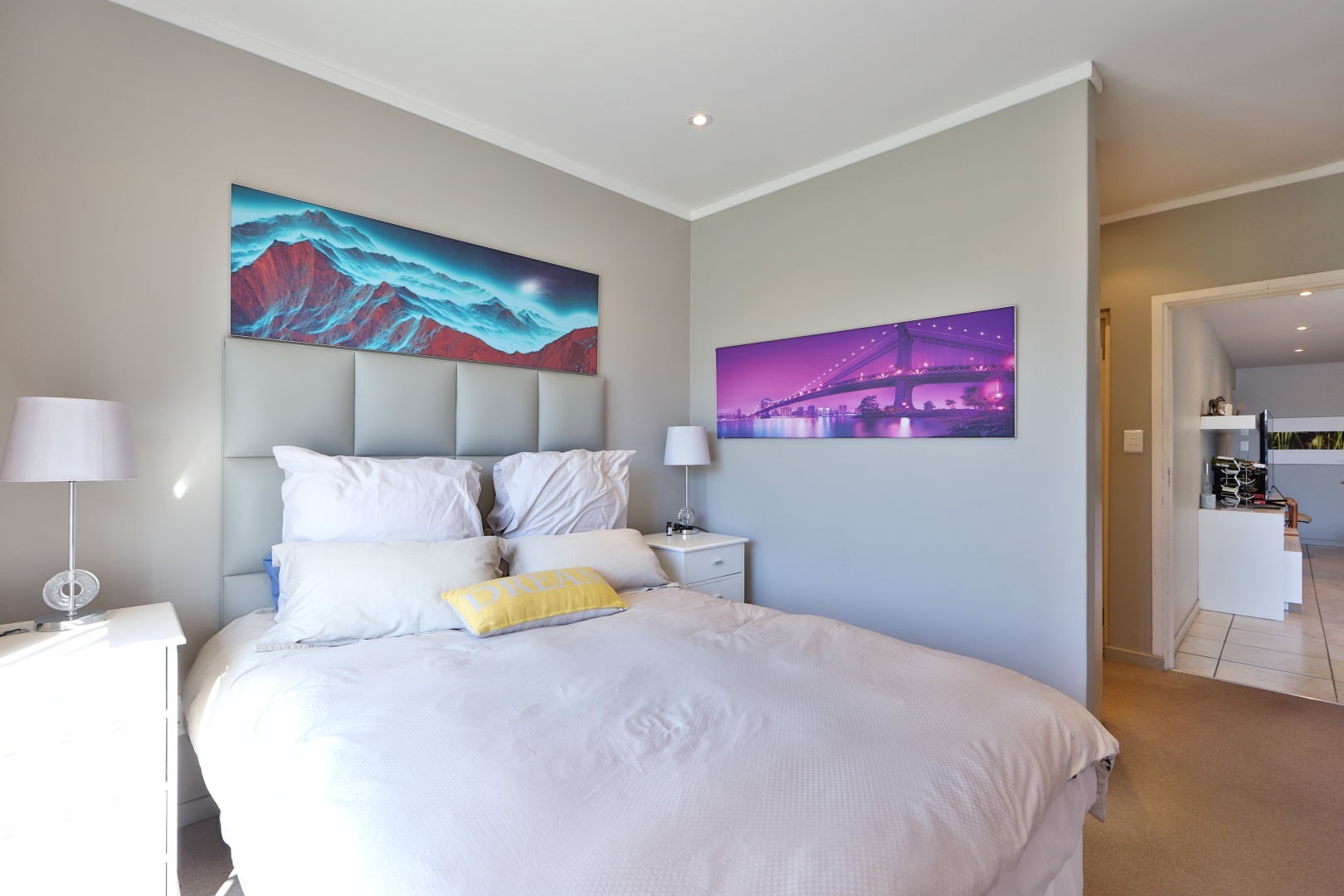 The second bedroom is also tiled, with light-colored built-in cupboards and an en-suite shower.
