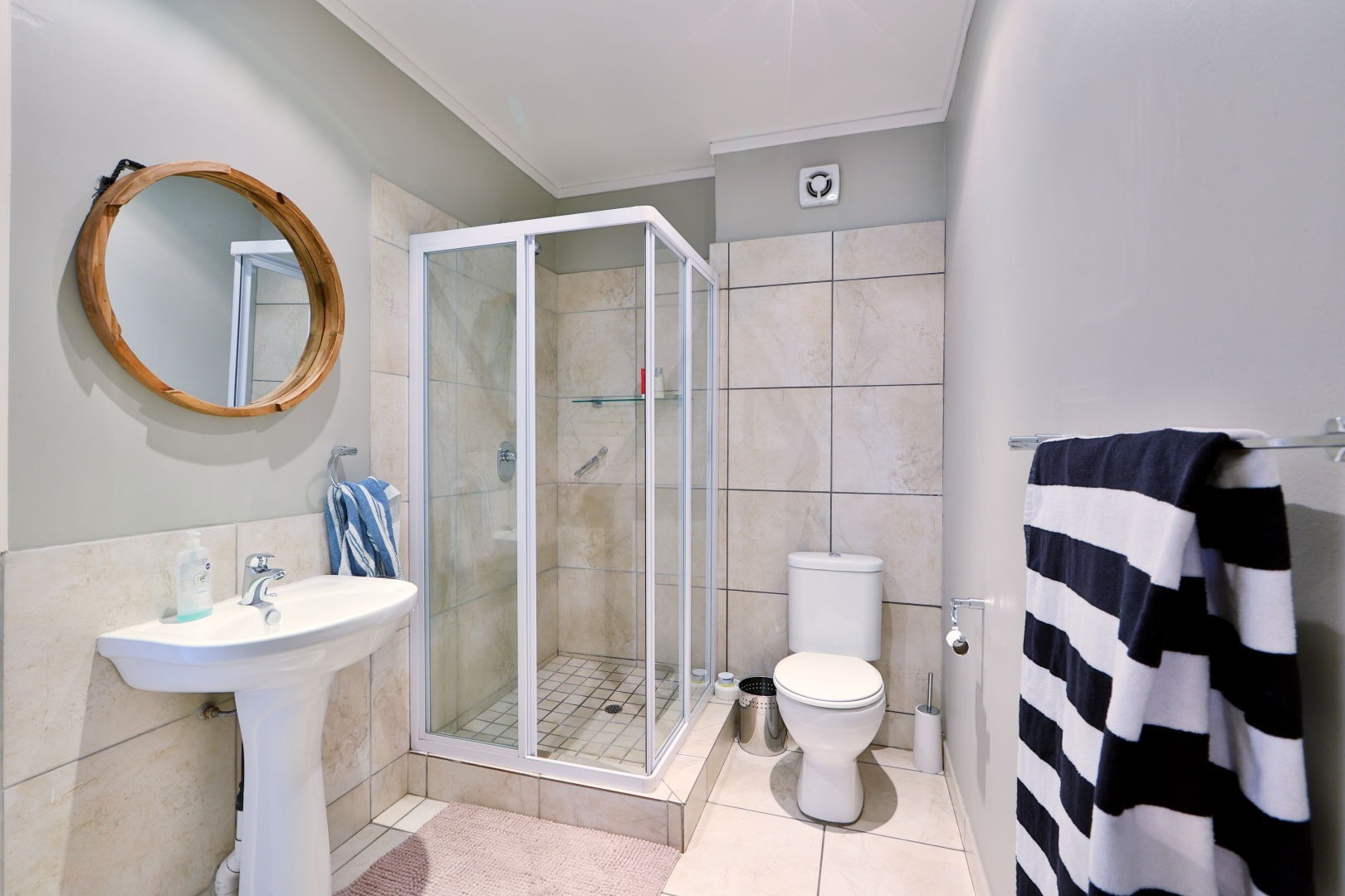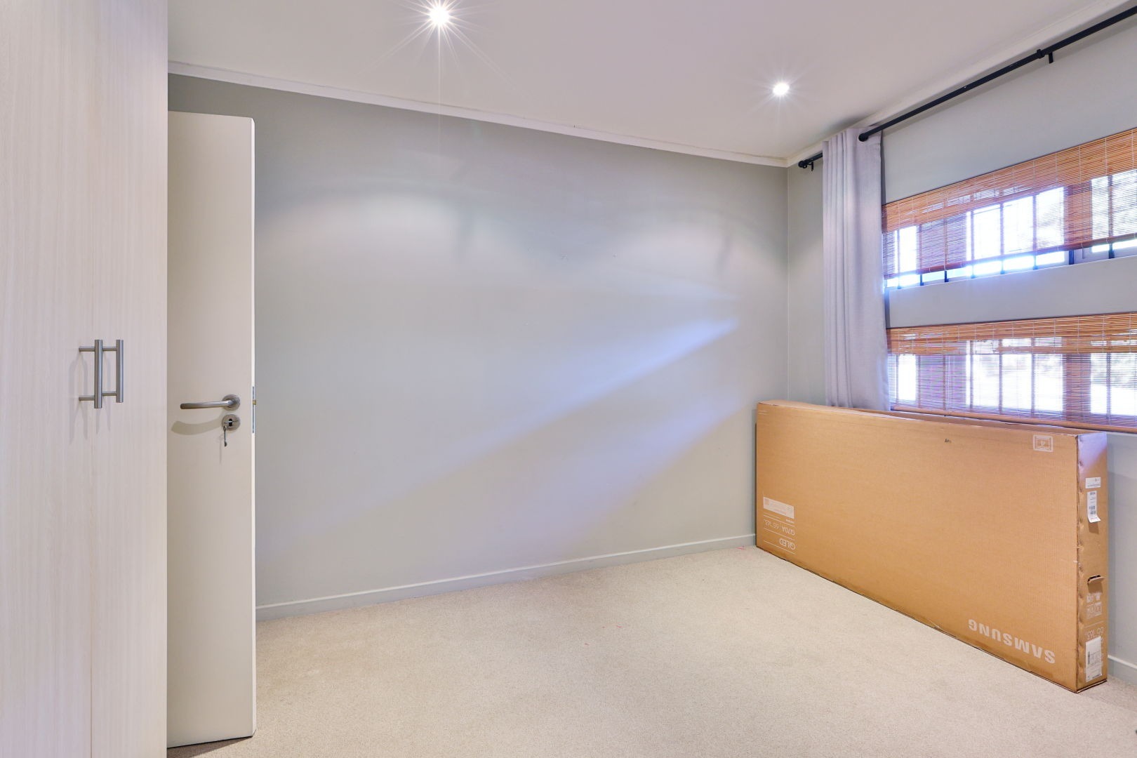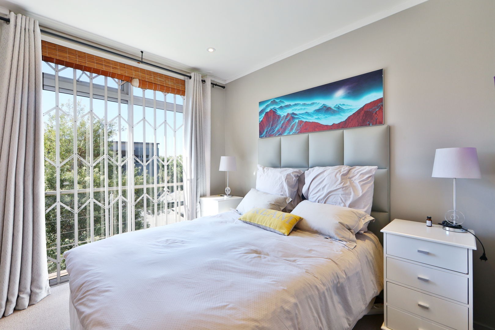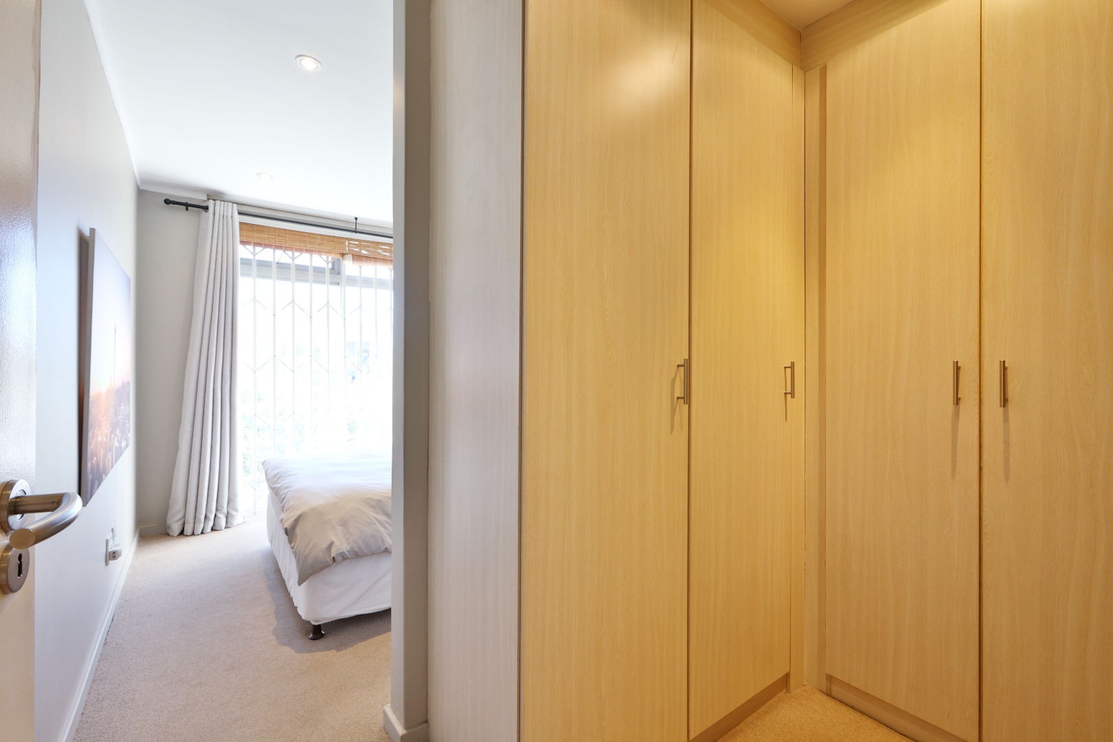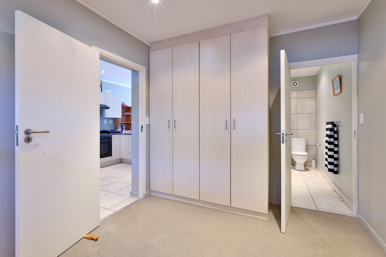 The second bedroom is also tiled, with light-colored built-in cupboards and an en-suite shower.