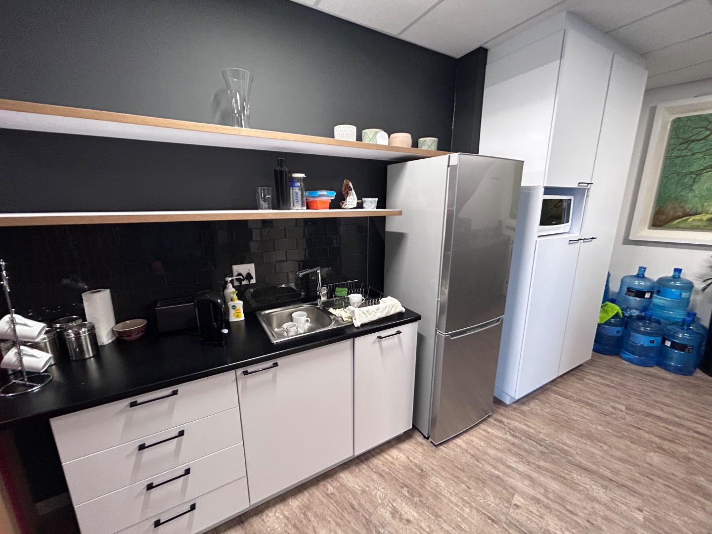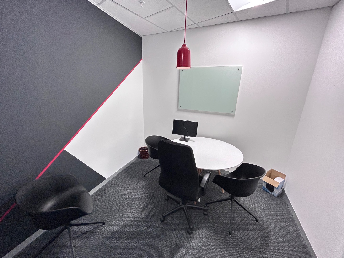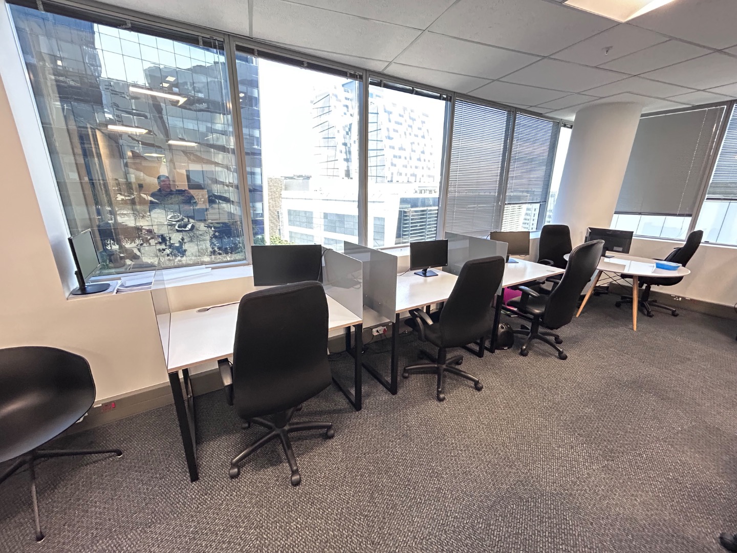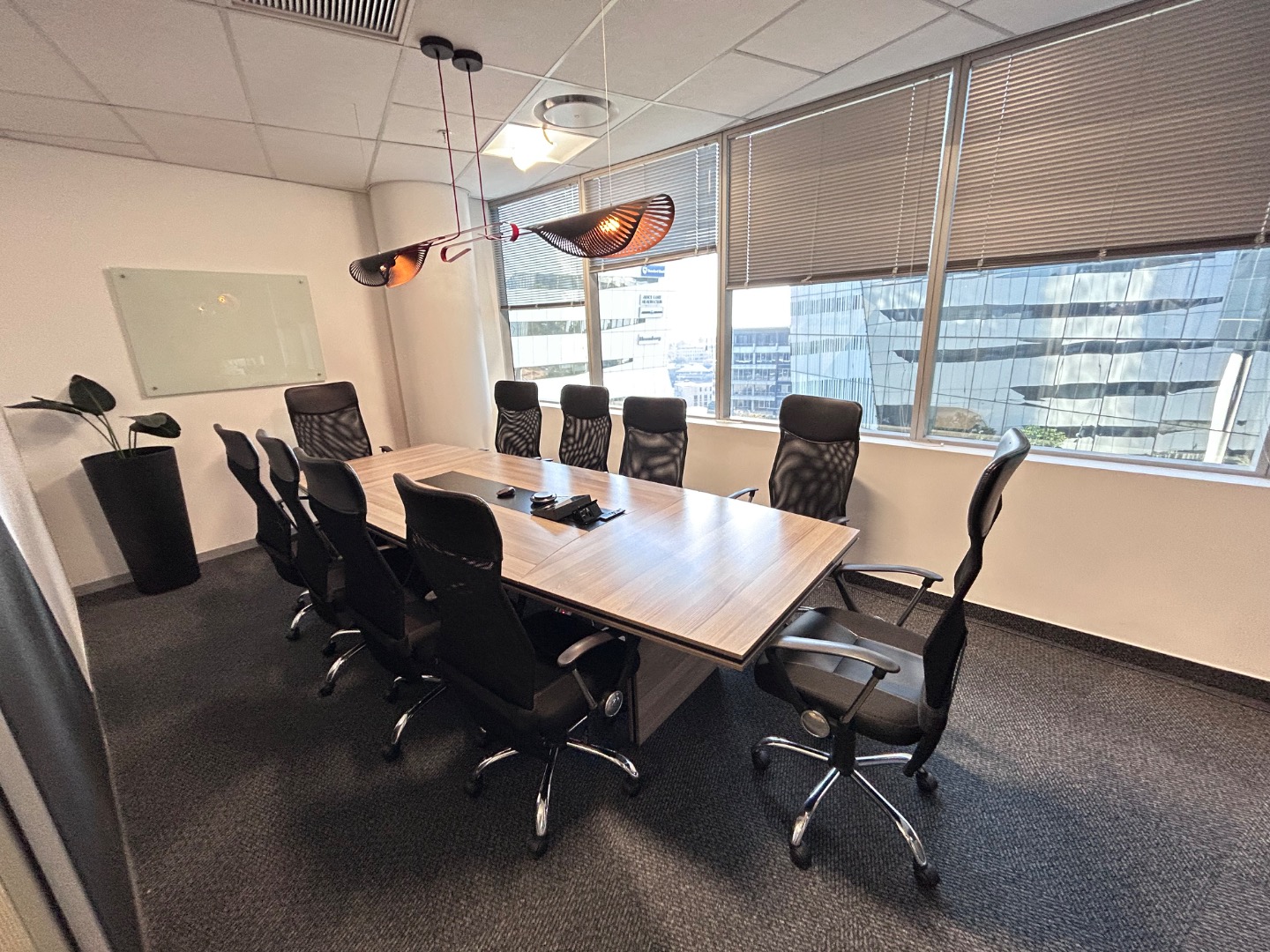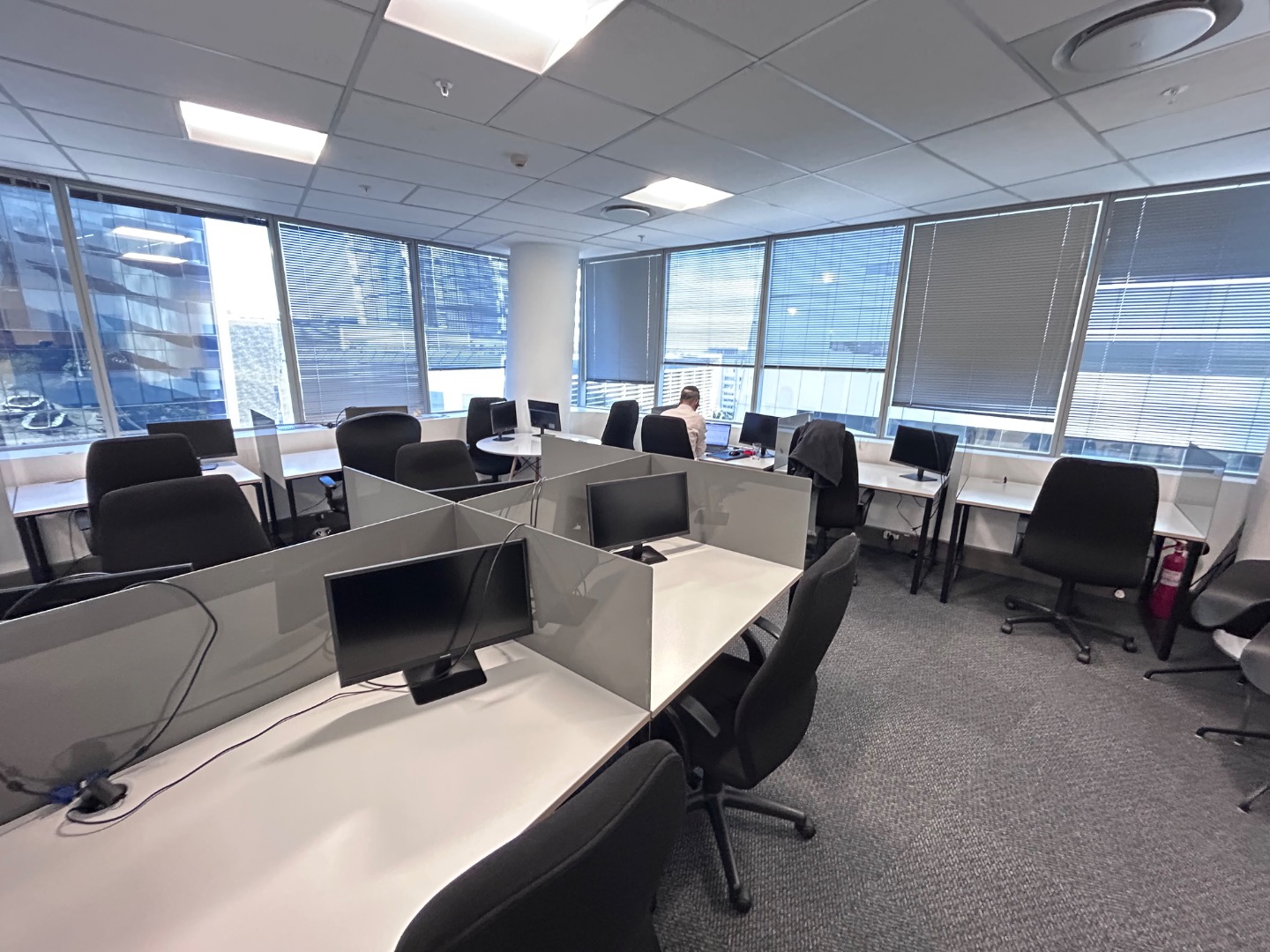 Office Layout: Reception, 2 boardrooms, 4-5 offices, 2 meeting rooms, open plan work area, kitchen with breakaway area.