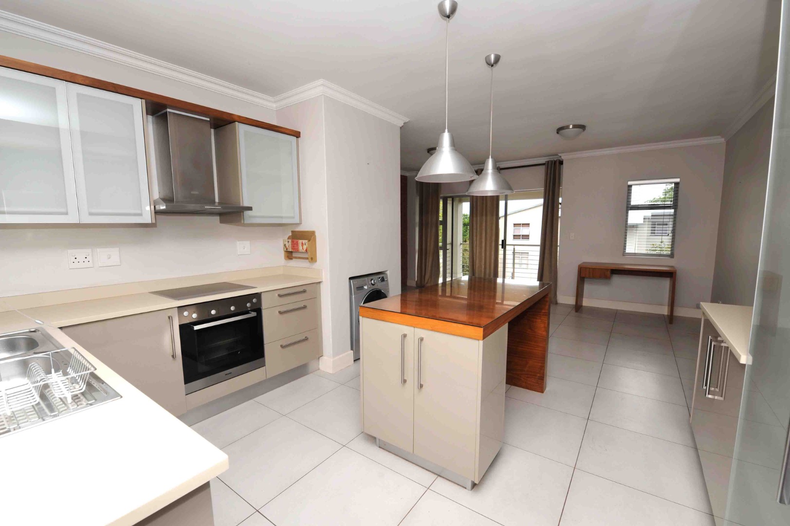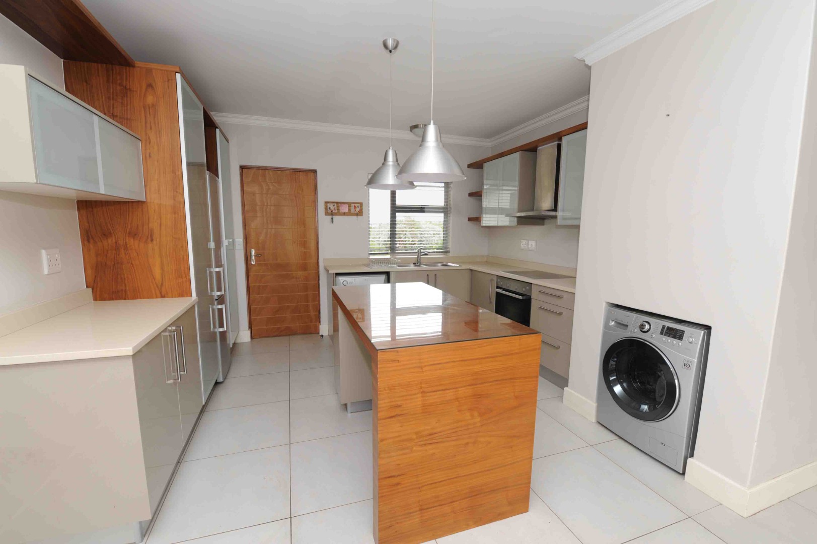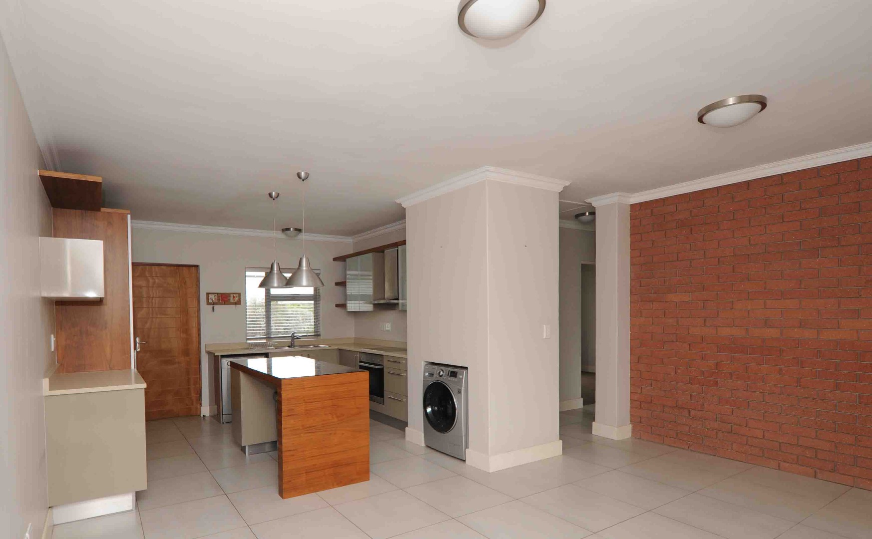 Open plan layout boasting a perfect stylish kitchen with Miele stove and appliances, living areas leading out to a covered balcony with gas braai.